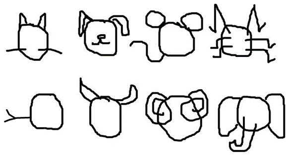 The quick symbolic sketching system works like this. First, a circle with body parts attached indicates “an animal” (Image 6). A 4-legged creature has no legs attached; an insect has 6 legs attached; 2 legs are for humans. To give another clue, well-known animal parts are attached to the circle. Below, in no order, are a grasshopper, sheep, dog, cow, snake, elephant, cat, and mouse.