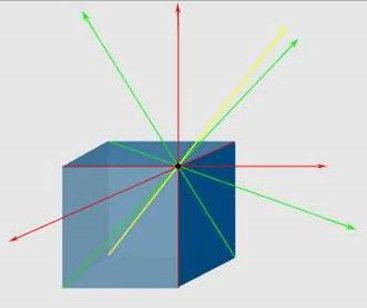 Almost all rooms and buildings contain cubic, rectangular, or rectilinear shapes which are needed for the game. To begin, my mind involuntarily draws imaginary lines from corners and surfaces of all rectangular or cubic objects in a room and projects these lines straight through space in all directions. Lines have no color and are invisible to others. But I see them, or rather, sense them. They have set positions in space and divide a room into zones. More precisely, lines are projected 1) along and parallel to edges of rectangles, 2) in line with diagonals through corners of rectangles, and 3) in line with diagonals through opposing corners of cubic objects. As an illustration of this, figure 1 shows a desk and its associated line projections. Top and sides of the desk are rectangular, and the desk is cubic. Figure 2 shows how each corner of the desk can have as many as seven imaginary lines radiating from each of its corners.