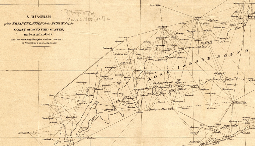 My mind game is similar to mapping a shoreline using triangulation surveying, such as the early map drawn for part of the U.S. coast surveyed and mapped between 1817 and 1834 (Figure 3). It is not practical to use measured coordinates to draw such a shoreline map. The maze of triangulation lines looks almost random, yet it is based on actual locations of shoreline features.